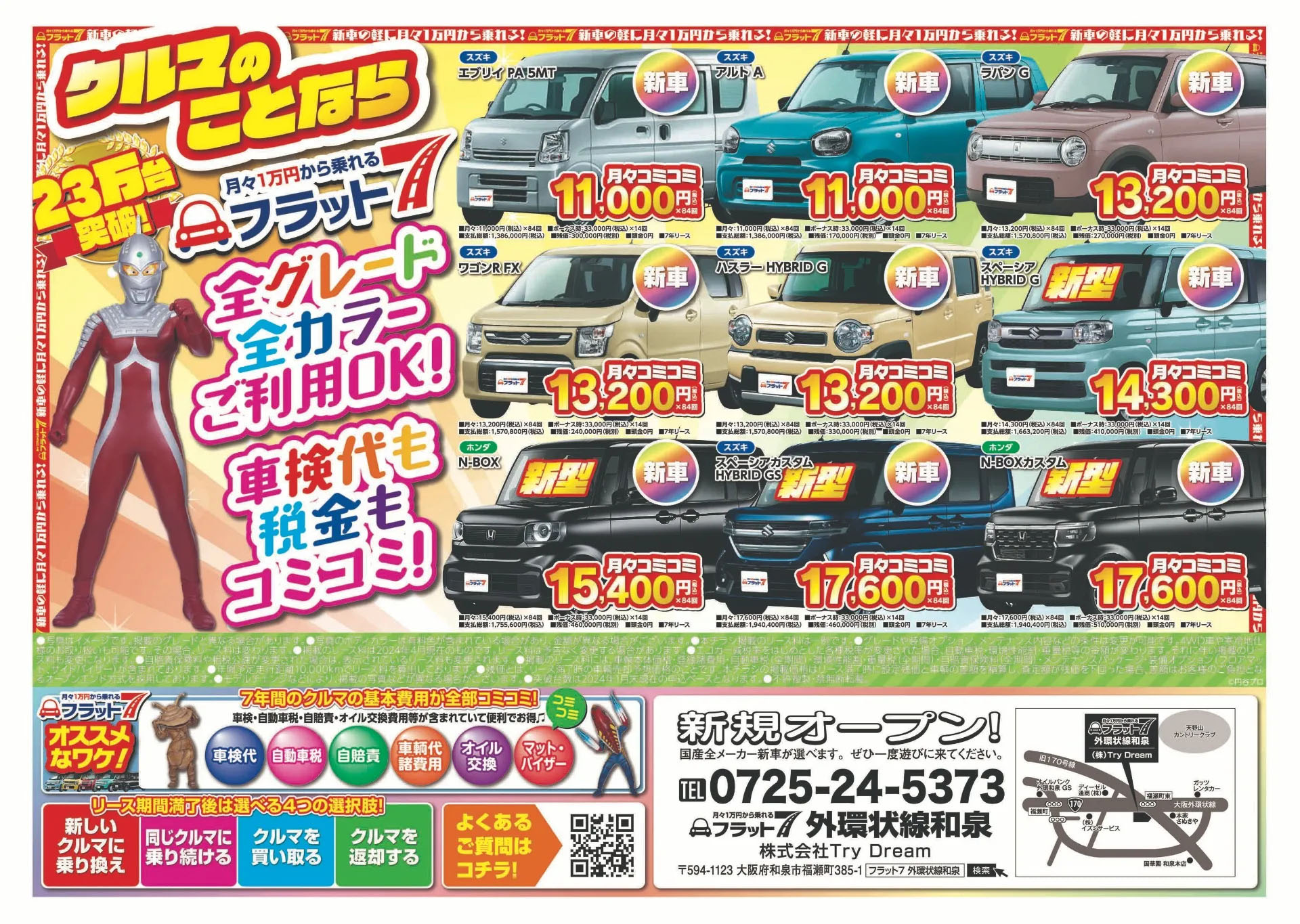 そのため実際の月々は割高にはなりません。設定残価はリースアップ時の売却予定価格ですので、フラット7では、人気車種に絞って高い残価を設定しました。